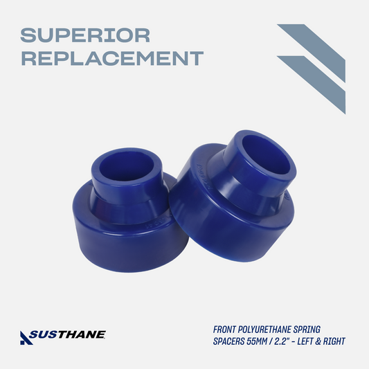 Upgrade your Wrangler / Rubicon with this SUSTHANE 8-Piece Front & Rear Polyurethane Spacer Kit 45mm / 1.8". Due to suspension geometry, this will give you lift height of 55mm, which improves suspension performance through proper spacing and alignment.