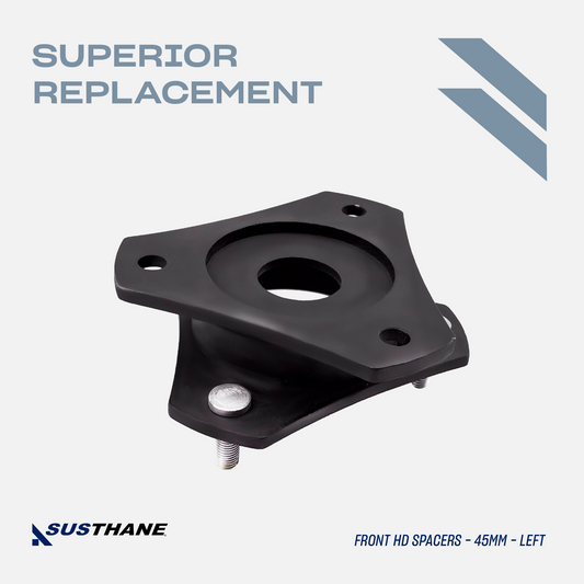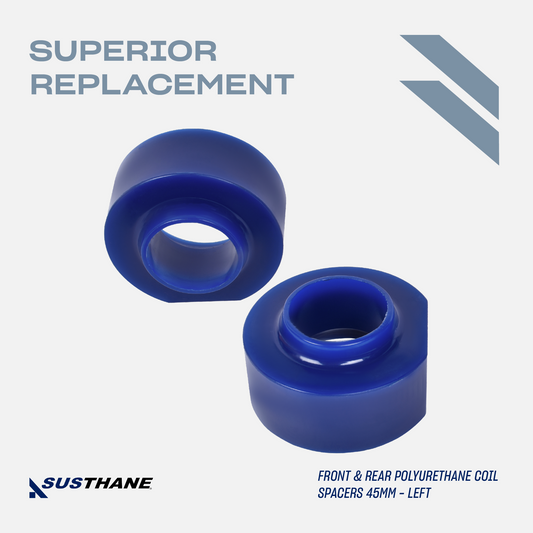 Upgrade your Wrangler / Rubicon with this SUSTHANE 8-Piece Front & Rear Polyurethane Spacer Kit 45mm / 1.8". Due to suspension geometry, this will give you lift height of 55mm, which improves suspension performance through proper spacing and alignment.