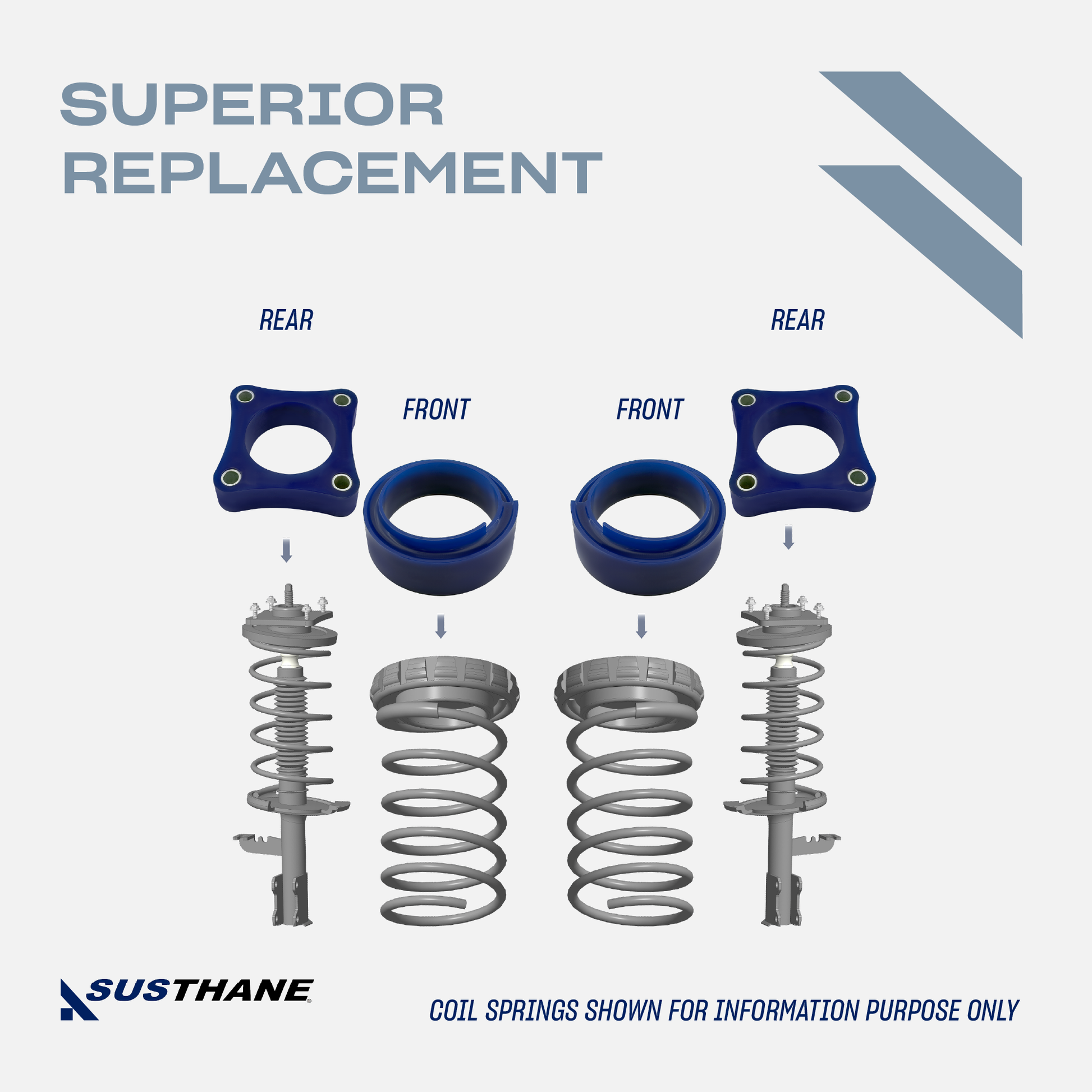 This AUTOACER 4-Piece Front & Rear Polyurethane Leveling Lift Kit is an excellent alternative to restore your vehicle's power and command the road. Engineered for durability and peak performance, this kit enhances your FORD / MERCURY / MAZDA from daily drives to weekend getaways.