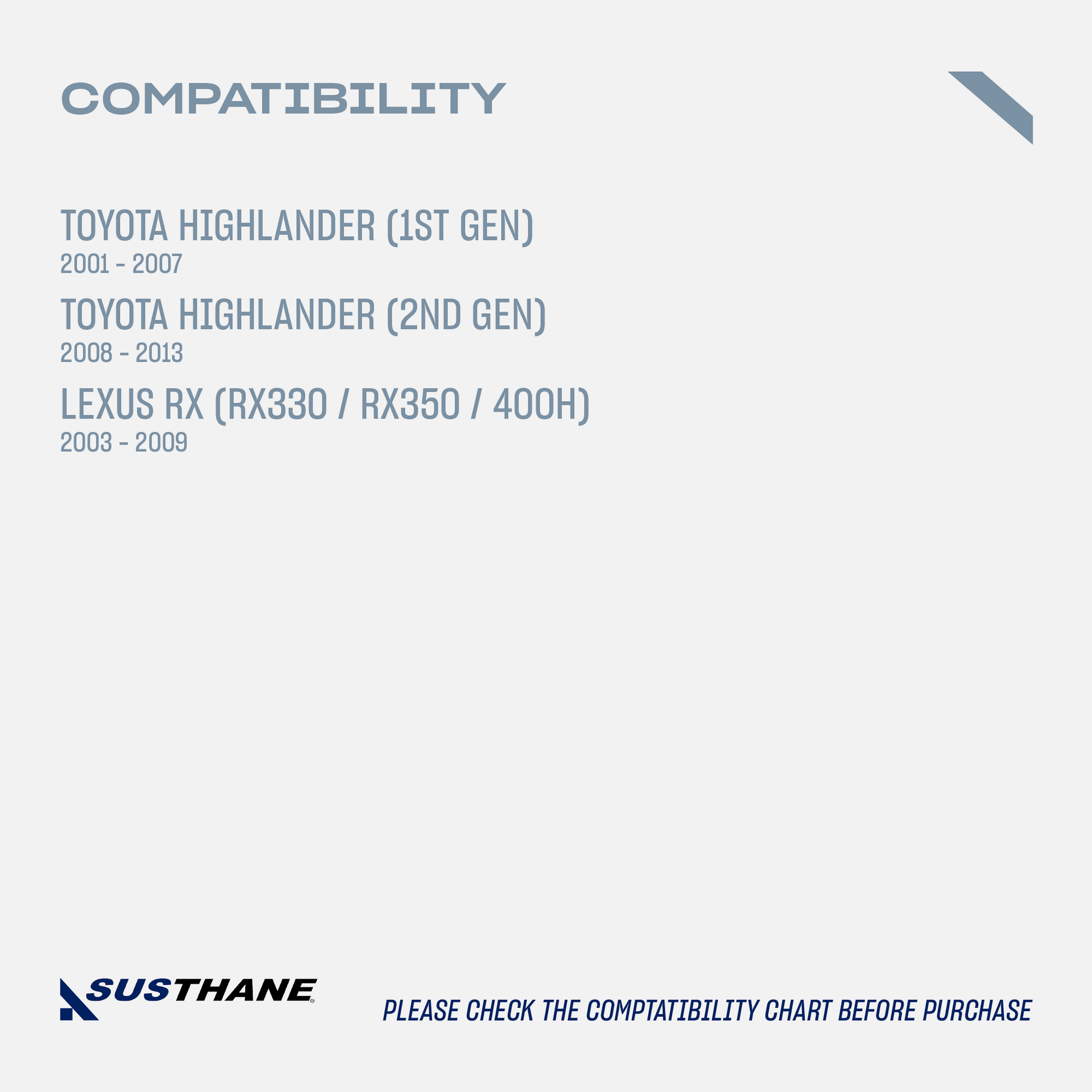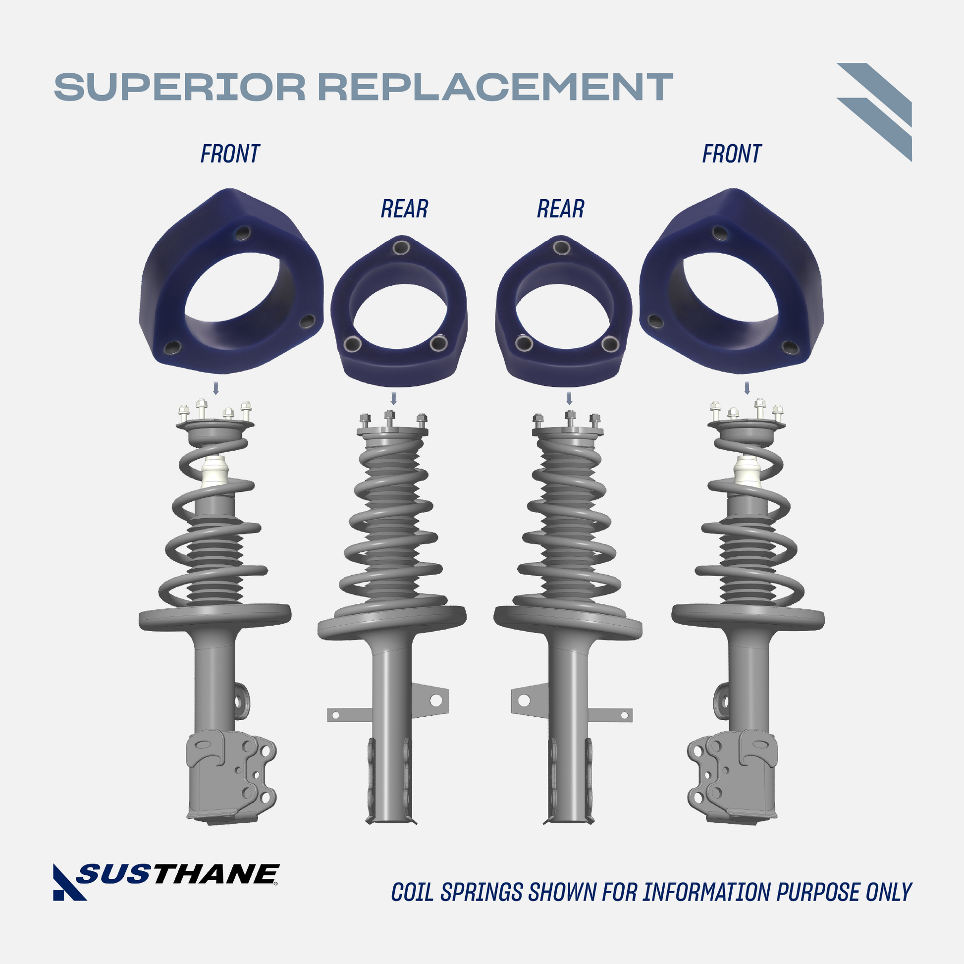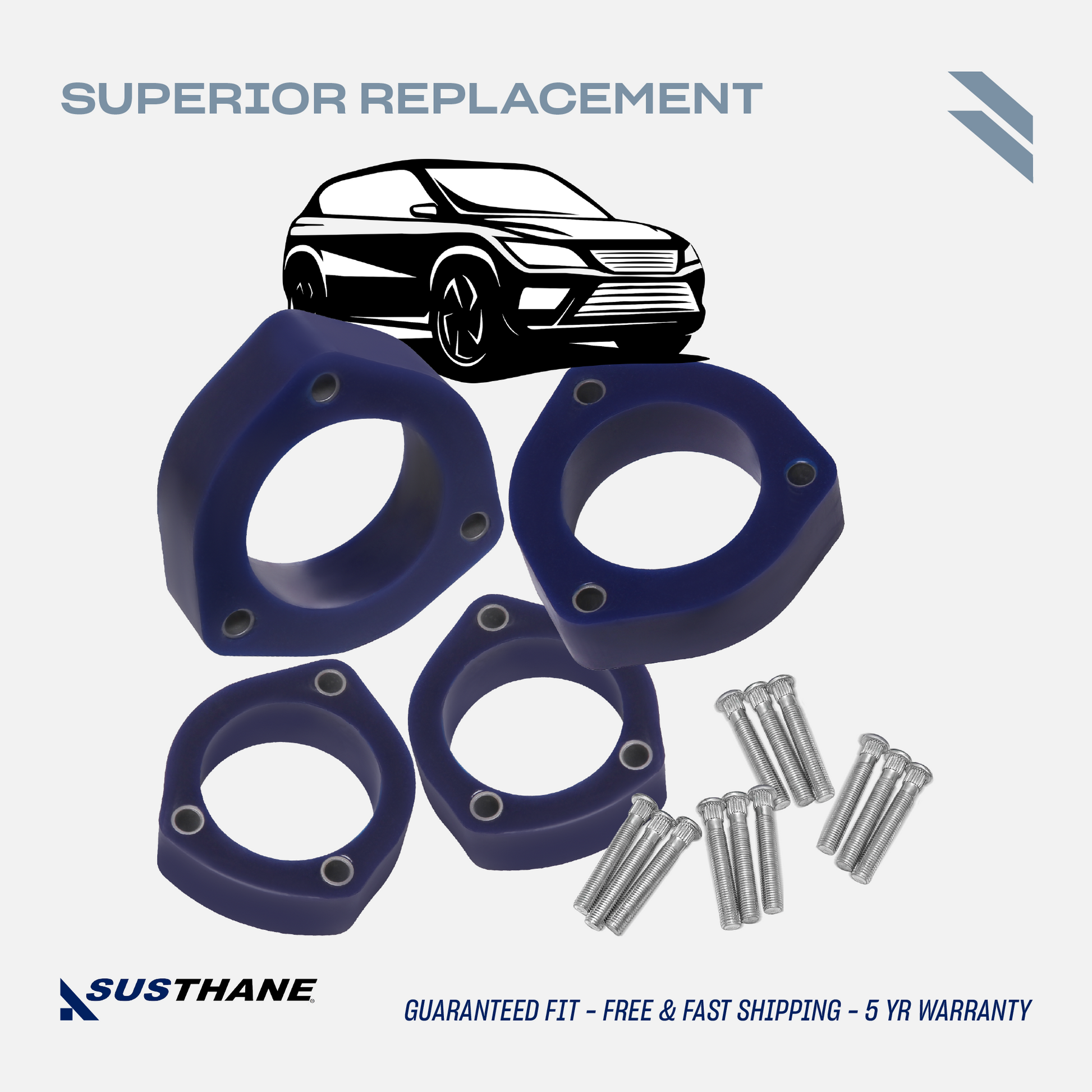 Upgrade your HIGHLANDER / RX with this SUSTHANE 16-Piece Front & Rear Polyurethane Spacer Kit 40mm 1.6", this set improves suspension performance through proper spacing and alignment.