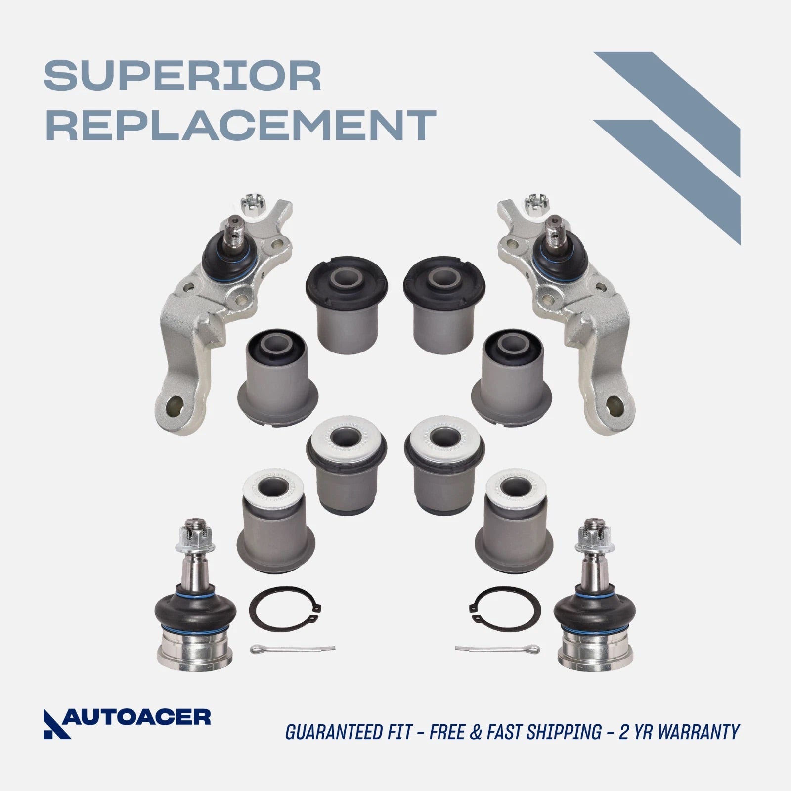This AUTOACER 12-Piece Front Upper, Lower Control Arm Bushings & Ball Joint Kit is an excellent alternative to repair the original control arms and front suspension to new heights. Engineered for durability and peak performance, this kit enhances your TOYOTA for both form and function.